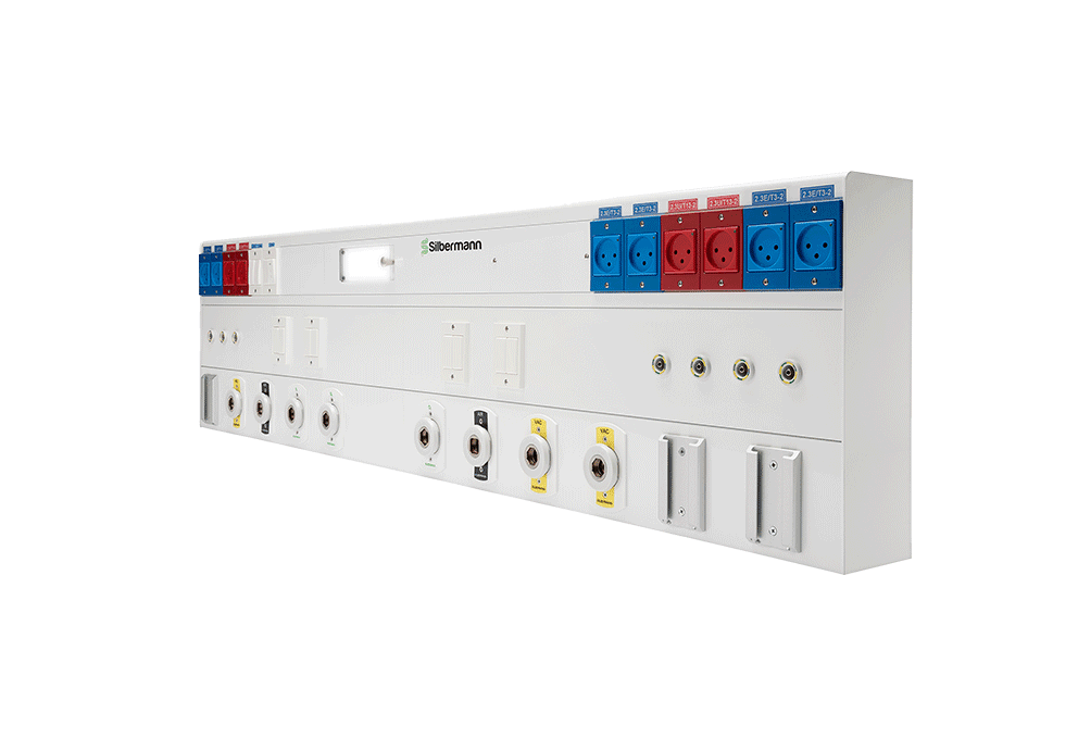 ■ Прикроватная консоль включает: прямое и непрямое освещение, электрические розетки, выключатели, телефон, вызов медсестры, розетки для мониторов и выходы для медицинских газов Silbermann's или по запросу клиента.